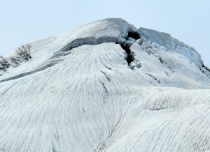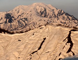 前方の一三八〇mピークを眺めながらどう登るのだろうと考える。先行していた二人組が登り始めた。割れ目の手前に近づき左のスノーブリッジを一人ずつ慎重にゆっくりと渡り終え、左上部の急な雪の斜面を登って行った。我々も登れそうだ!どうするか皆で相談する。未丈ヶ岳から先はたぶん雪が少なく残雪の割れ目、藪がどれだけあるか、さらに下山地の尾根はすでに雪がほとんど無いようで、猛烈な藪歩きが考えられる。さらに途中で引き返した場合でも、割れ目が大きくなって安全に戻れるだろうか、などなど。目の前のピークは越えられるだろうが、安全第一で引き返すことにした。一二八八mピーク手前の鞍部まで戻りテントを設営する。どちらを眺めても山しかない雪の尾根で宴会を始める。翌日も良い天気で明ける。越後駒ヶ岳、中の岳が朝日を浴びて鮮やかに色づく。昨日先行した二人組が慎重に渡ったスノーブリッジが壊れていた。頑張って越えていたら引き帰れなかったかもしれない。帰りも藪漕ぎが待っていた。一二五〇m尾根に藪漕ぎで登り、尾根を通らず左斜面を下る。スキー場に戻り、リフトを使って一気に下る。小出駅への無料送迎バスの時間まで約四時間もある。長谷川さん、結城さんはスキーを楽しんだようだ。残りの二人はビールを飲んでしっかりと昼寝をする。小出駅で待っている間にデポした車を回収していただいた。ご苦労様でした。敗退したこともあり温泉にも寄らずにそのまま帰ることにした。お疲れ様でした。