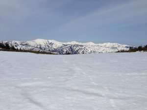 今回は、私のデビュー山行です。山行形態も解らず、参加者の方々の名前と顏も性格も解らない、不安だけの参加でした。今年は雪が多く、除雪作業が遅れ、五月二日午前10時に七入~御池まで、私達に合わせて開通とのことでした。大宮を前日一九時三〇分に出発し、大型連休の渋滞にはまりながらも檜枝岐へ。真っ暗な田舎道の中に、まずはたぬき君のお出迎えを受けました。それを巧みに避けると、次はハクビシン(?)そして最後にクマ君登場! 体長1.2メートル位のクマ君が目の前を横断して行きました。キャー! ビックリビックリ! さすが檜枝岐!クマ君と喧嘩をすることもなく、ミニ尾瀬公園に二時半着。五時起床。御池の駐車場まで移動。雪の大谷のような雪の壁の駐車場を、いざ出発! ピーカンのお天気と、腐った雪でした。夏道沿いの登り始めからちょっと急登。でも、賑やかなお喋りのまま広沢田代に到着。「はーい十分休憩」ではなく、思い思いに水分・行動食補給してすぐ出発でした。聞けば、水分補給もお昼も決まった時間はなく、各自適当に摂るとのこと。こんなところにも、新参者の戸惑いがありました。真っ青な空に真っ白な山! わー、早く山頂で三六〇度見渡したい!その後も、順調に高度を稼ぎ、熊沢田代へ。お隣さんの会津駒が目の前に大きい。高度を上げるにつれ、未丈や越後裏三山と言われる中ノ岳・越後駒・荒沢が見え始めました。遠く吾妻連邦や飯豊連峰まで見えます。この景色を元気の源にして再出発。山頂直下の最後の急登を頑張り、あー俎グラ到―着―! 先に芝安グラが見えます。行きたいと言っていた人もいますが、それは無視。東側には、日光連山とドーム型の日光白根。その下に真っ白な尾瀬沼が広がり、右側には、至仏まで真っ白な尾瀬ヶ原が続いて、私のデビュー山行をお祝いしてくれていました。感激!感激!十二時に着いたのに十二時十分発。えー! 十分しかいないの~? せっかく登ったのにーもったいな~い!先程登った急坂をコワゴワ下り始める。でも、そのうち、ズズーっと踵で滑り下り、わーい! エスカレーターだー! 眼下の真っ白な熊沢田代を目がけて急降下! わー、鳥になったみたーい!熊沢田代から夏道をそれて東田代へ。途中の東田代付近で、燧ヶ岳を振り返ると、山頂から噴煙?! いやいや飛行機雲でした。お日様には日輪が掛かり、とってもきれいな空です。雪の斜面を勝手気ままに下り、トラバースして広沢田代から姫田代へ下ります。雪山は、何処にでも入れるのが旨味だなー。駐車場手前の沢に水芭蕉の赤ちゃんが顔を出し、ちっちゃく咲いていました。春ですね。十五時御池着。山行中のとある出来事。不思議ちゃんが、下山途中「水島一緒に帰ろうー」と叫び始めました。「ん? それ 『ビルマの竪琴』 ?!」「これ解るの、ある程度の年代だよねー」「そうそう。キャハハハハハー」軽口を叩きながらの楽しい山行でした。(記T中 孝子)