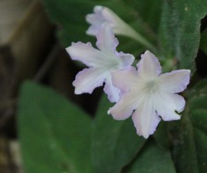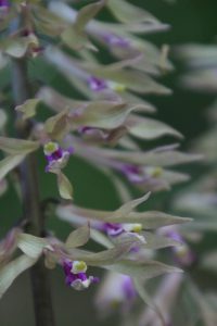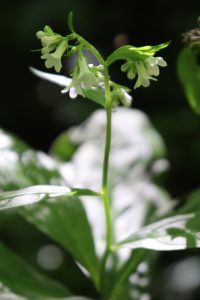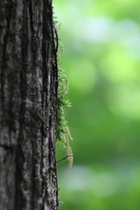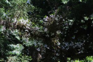 KTさんの「高尾山に着生ランのセッコクを見に行きませんか?」のメーリングを見て自然界に咲いている本物を見たいと思って参加しました。 登山口である、高尾山口は平日にも関わらず、遠足の小学生や、外国の人、年配のグループ、若者たちなど人であふれていた。私たちは沢沿いの登山道の六号路で行く。ここは登山者も比較的少ない。所々で花を探しているグループに合う。沢を吹き抜ける風が心地よい。琵琶滝と大山橋の中ほどまで来ると、人だかり、セッコクの花を見ていた。セッコクは沢沿いの杉の大木の上のほうに、沢山の小さな白い花を咲かせていた。腕のように横に伸ばしているたくさんの枝に着生して咲かせている。中には糸のように垂れ下がって、咲いているものもあった。日当たり、風とおし、湿気など、微妙な環境で杉の枝に着生しているのだろう。初めて見る幻想的な素晴らしい光景だった。更に登っていくと、細くなった沢沿いの反対側に花を見ているグループがいた。さわるりそうの花を教えてもらった。白い小さなムラサキ科の花だ。更に進むと、沢の源登部で花を探している人にあった。イナモリ草を探しているとのこと。先を歩いて、「咲いていましたよ」と待っていてくれた。見過ごしてしまいそうな小さな花だった。薄紫の五ミリほどの星形の可憐な花だった。山頂に近くになってイチヤクソウの仲間のウメガサ草も登山者に教えてもらった。見落としてしまいそうな地味な白い花だった。息を切らしながら、急な木の階段を上ると山頂に出た。山頂では沢山の小学生が楽しそうにお弁当を広げていた。富士山の裾まで望める広々とした山頂で老いも若きも、外国の人びとも憩えて、癒される山が大都会東京のすぐそばにあった。普段ほとんど人に合わないような静かな山を好んで歩いている私も、高尾山の秘めている多様性に学ばされたことが多かった。下りは三号路でくだる。ここは歩いている人もまばらで、サイハイランの群落が何か所もあって、初めて見る光景にびっくりした。イナモリ草の大きな株にも出会えた。花の時期を過ぎた沢山の種類のすみれの群落もあった。きっとタカオスミレもあったのでは?下山で出会った人が話していた。「高尾山は古刹、薬王院の信仰の山、『殺生はしてはいけない』という掟がずっと守られ、一切人の手を加えることなく、豊かな自然が保たれて来た。」と話してくれた。(記 K原塚)
