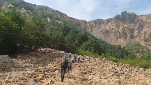 頂上からの下り、登山教室で来た地元の小中学生が登山道に繋がった。元気にあいさつを交わす子、いじけて反応の鈍い子、様々だ。弘法清水まで下り、中の湯を目指す。磐梯山の最短経路である八方台コースと重なるので、人が多い。硫黄の臭いがしてくると中の湯だ。小屋は営業をやめて久しい。主が営業を止めるとき、後継ぎを誰かやらないかと、高橋東吾さんから例会で話があった。主と東吾さんは知り合いだったみたいだ。
