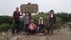 道は樹林の中に入り急登になる。登山道の両側には、柵用に大きなU字形の鉄パイプが差し込んであり、それを掴んで、楽に登れる。足元には、ミヤマカラマツ、ウスユキソウ、ハクサンチドリなどの花が出てきた。塩Tさんや大地さんが写真を撮っている。登り詰めると、櫛が峰との鞍部。南面、猪苗代側からの登山道が合流して、人が多くなった。ユリや撫子の花が増え、間もなく弘法清水の小屋。一休みして、頂上へ。すぐと思ったら、ごつごつした岩の急登で、汗をかいた。10時45分頂上。霧、念力で一瞬だけ霧を払い、猪苗代湖を見たが、またすぐ閉ざされた。
