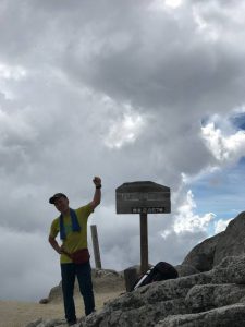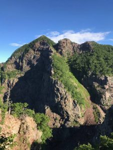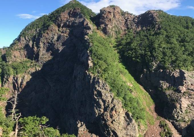 三ツ頭まで同じ登山道を引き返し、10時10分に荷物をピックアップ後、烏帽子岳に向かいます。烏帽子岳は展望の良い岩稜の山、気分よく山頂へ登り案内板を見て一同唖然、地図上の空白区間、大岩山まで3時間と書いてあります。駐車場までは8時間以上かかる計算です。八丁尾根は地図上登山道は示されていませんが、きれいに整備されたふかふかな登山道で、岩稜あり、はしごありのそれなりに楽しめるコースでしたが、長い・・・。二人のKさんの無言のプレッシャーを浴び針の莚の道を進みます。また、アップダウンも多く、特に途中の大岩山では梯子、鎖、ワイヤー有の150mの急登、ここで体力のほとんどを使いきります。途中で雨が降り始め、更に気が滅入ります。16時ごろようやく日向山に到着しました。もうこの頃には疲労困憊ですが、まだ、駐車場まで2時間近い道のりです。19時に尾白駐車場に到着しましたが長い一日はまだ終わりません。一同放心状態のまま近くの尾白の湯で汗を流し、韮崎ICの近くで食事をしてようやく一息つきました。ふと、我に返ると10時近く、あ、電車がない・・・。