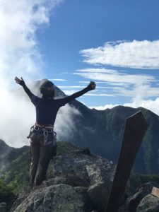今回のテーマは軽量化。食事は各自の個食で、お湯だけ配給。シュラフは持たず、シュラフカバーと防寒着で我慢する。お酒は少しで酔えるウィスキーと乾きもののみ。しかしテント、ロープやガチャ類などの登攀具、そして、暑さ対策の飲み水が以外に重く、14~15kgになってしまいました。ハードな山道ではこの重さがじわじわと体力をそぎ落としていくことになりました。