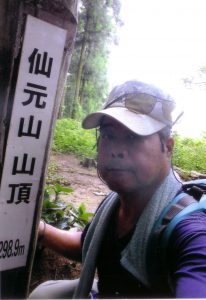 5:30 自宅を車で出る。7:30 曇り日の「道の駅」を出発。槻川にかかる橋を渡り、西光寺の門前を経て山道(遊歩道)に入る。間もなく「カタクリと大ムラサキの森」へ。10人余りの方々が小屋を清掃していた。山道の両脇は樹齢50年程のヒノキ林が続く。丸太の階段と滑りやすい道が交互に続く。前日来の雨でストックを車に置いてきたことが悔やまれる。やがて前方が開けて小屋が見えると「見晴らしの丘公園」に出る。8:10 東への林道終点より、再び山道に入ると東屋があり、ここで一本立てる(一休み)。ここからは東方面(下里)が開けて見える(標高約220m)。尾根の東側をゆるくまく様に進むと「下里の大モミジ」(寛文期=やく350年前頃、検地のため通りがかった役人が命名したという)を左に見て、何度か尾根の東・西をまく。途中、パラグライダーの出発場所を通過する。急な登りに一汗かくと避雷針の付いた見晴らし小屋へ。ほんの少し上が「仙元山」の頂上だ(9:00着)。相変わらずの曇りだ。頂上はヒノキを混えた雑木林で西北側のみ開き、官ノ倉山(344m)や小川の町並みが見渡せた。自画撮りし、往路を戻り(9:30)、「道の駅」へと下山(10:30)。 (記 K杉)