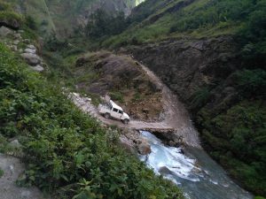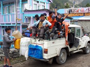 7時半、貸し切りバスで出発。ガイド・クライミングサポーター・キッチンボーイ・ポーターを合わせ11人そして私たち3名の14名とたくさんの荷物を載せ、ベッシャールまで約8時間の道程。埃っぽいカトマンズ、そして狭い道なのに大きい車が多く、クラクションを鳴らしながら追い越していく車。はみ出すくらい乗っているバス。何本もぶら下がった電線。あちこちのゴミ。驚きの光景と新鮮な光景が目に入る。