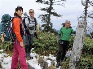 ようやく鳥甲山のピークに到着だ。休憩して行動食を口にしていると、K池さんのところに毛虫が遊びに来て大騒ぎとなる。もう雪に覆われ始めたので助けを求めに来たのかもしれないが。