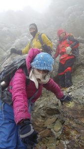 下山開始、岩場の下降はやや濡れていて