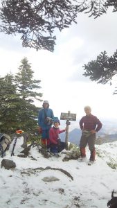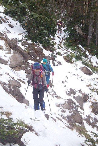 大嵐山の西の斜面をトラバースしながらガラ場を2度越えて進むと尾根に出て正規の道と判断、もし道間違いで登り返しに時間がかかったら日没で登山中止、折に雪も結構降ってきて、山中でビバークという最悪の状況が一瞬よぎっただけに、ほっとした。