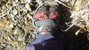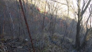 11:40 下山開始。登ってきた時の斜面を思い出すと暗雲立ち込める思いがする。シカの食害を防ぐフェンスが手掛かりとなり下山をする。それでも足場はもろく、危ない連発。