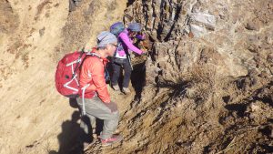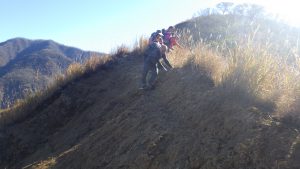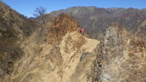 横場山頂上を過ぎ下草がフカフカした気持ちの良い尾根を歩いてゆくと、右側がザラリと崩れていて危ないし、左側も転がったら止まるのだろうか?というような箇所がちらほら出てくる。樹木のない禿山は、風雨・日射にさらされ岩がボロボロとしている。足場も悪いが、持ち手も悪くヤバイナ~という気持ちがモクモク湧いてくる。