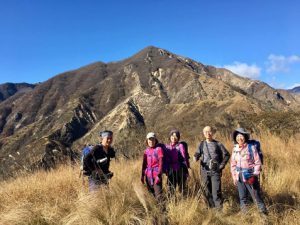 標高差250mを1時間程ゼーゼー言いながら登り、横場山頂上手前で一本。鉱毒で禿げ上がった山を再生させようと、植林工事を進めている対岸の山を眺めて休む。