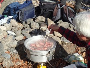 当初の予定は、前日筆頭岩に登り、次の日星穴岳の予定でしたが会の下草刈りがあったのでその後に道の駅妙義にテン泊することにした。秩父から車で一般道を走るが遠いこと。途中今晩の食材おでんを購入し17:00頃道の駅に到着、まだ早いのでモミジの湯に入る。ここは海抜650mの温泉で毎日量や温度が変動するという。温泉は生きていると感じた。510円だが70歳以上は三百円、S田とさんだけが恩恵があった。道の駅にテント張りいつもの宴会。