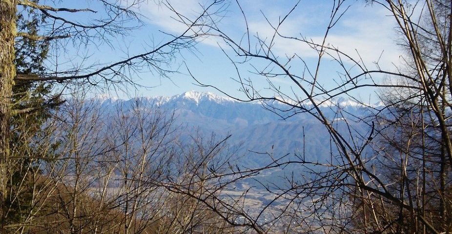 29日、車で駒ケ根高原スキー場近くの林道を古城公園まで上がるとゲートがあった。そこから歩き出す。「あかつきの塔」と呼ばれる展望台が道脇にあり、仙丈を正面に南アルプスの絶景が見られる。凍った林道を転ばないように注意して進む。途中から山道に入り、少し行くと林道終点に着いた。夏はここまで車が入る。