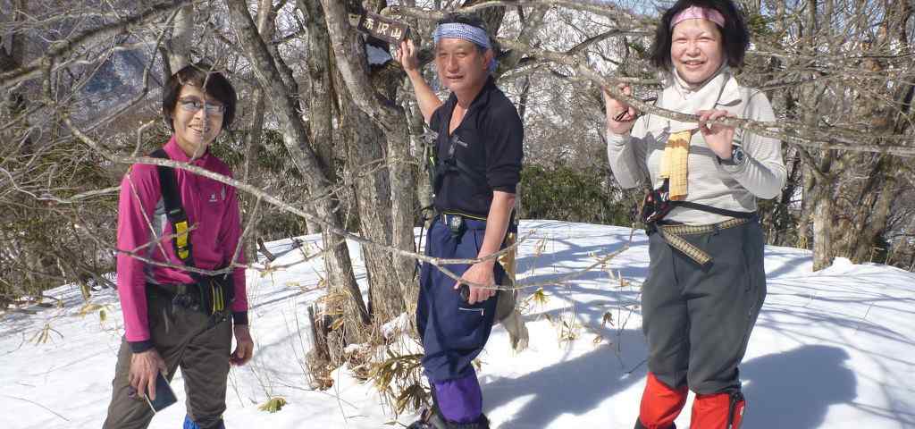 稜線に出ると雪が現れわかんを履く人、スノーシューの人、アイゼンの人、何もはかない人、とそれぞれで登るも気温が上昇し雪の上は3歩ごと膝上まで潜ったり潜らなかったり。途中から全員わかんとなる。わかんでも潜ったり潜らなかったりですこぶる疲れる。