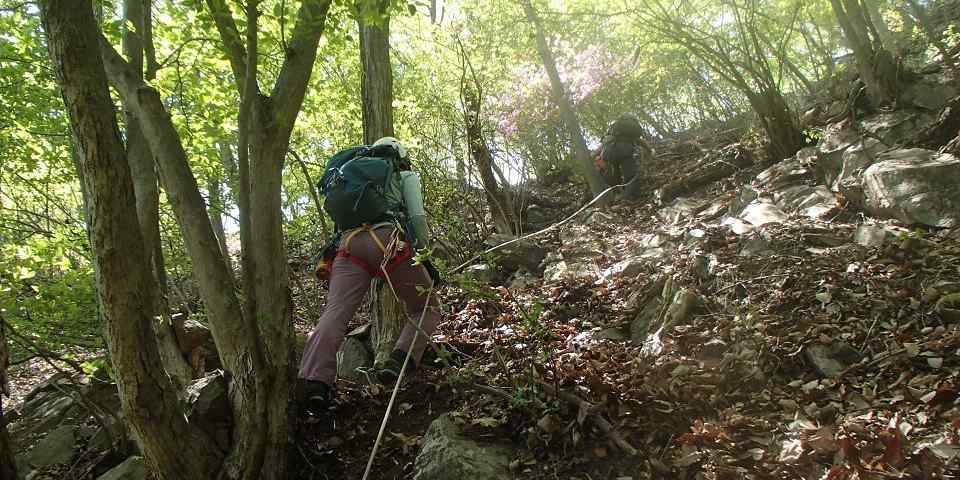 身支度を整えて、まずは落沢岳を目指します。倒木を避けながら沢に沿って進み、上空が徐々に開け、沢が二又に分れたところで、沢から外れて急坂を詰めると西牧南牧分水尾根に到着します。それから尾根伝いにさらに登っていくと、しれいた山と落沢岳との分岐点に達するのですが、傾斜も段々ときつくなり、岩場も現れます。岩は全般的に脆いので慎重に登っていきます。分岐点まであと少しというところで、いよいよ崩れやすい岩質となってきました。尾根上をこのまま登るのは危険と判断し、一旦懸垂下降で足場の良い地点まで降りて、前方の岩場を迂回するような形で分岐点へ達するルートを探ることにします。右から巻くのは厳しく、左からは目印のテープが続いているのを確認できたため、左にトラバースしながら上昇することにします。テープは途中で消えてしまいましたが、見上げると稜線までもう少しのため、立木を手がかり足がかかりに、できるだけ傾斜の緩いラインをルーファイしながら稜線へと達します。