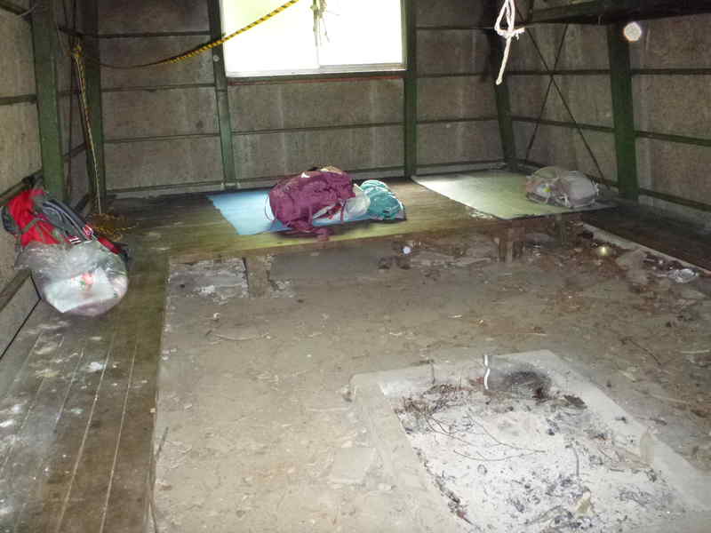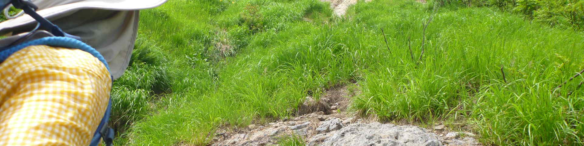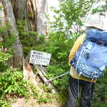 下界は毎日35℃の猛暑、清しさを求めいくつかの山をプロット。沢筋の登りでここを選ぶ。目標5:00出発と北本を前日17:00に出発する。しかし楢戸沢の林道に入ってしまい1時間ほどロスした。登山口にテントを張りいつもの通り軽く1杯が中くらい一杯になりつい寝過ごし5:50出発となった。5時頃4人の女性軍団宿の車で現れ先に行った。朝から気温27度700m近い標高なのに、出発すると笹の朝露がズボンをビショビショに濡らす。出発して20分T嬢「ちょっと休まて」歩いて5分もしないうちから大汗、「今日は頂上無理かな」と一瞬おもう。三吉ミチギの水場に着くと湧き水から出る水が冷たい。頭を冷やしここからつづら折りの長い登りで人見の松で尾根に出る。照り付ける太陽がジリジリ東北の山とは思えない暑さ。叶の高手から標高で200m下がった暗部に避難小屋があった。
