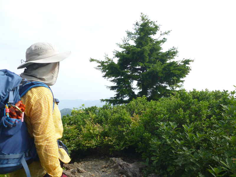 そこに朝あった女性軍がいる。不要な荷物を置いて頂上へ行くと のこと。日帰り登山で何を置いていくのか不思議。先に行く。T嬢山で追い越されることはあっても追い越すことは今まであっただろうか。本人もびっくり。頂上直下は急な岩場。所々ロープが張られてあったが結構な岩場だ。慎重に上り頂上かと思いきや右に50m位尾根筋を行った所が頂上。頂上は360度のパノラマだが天気が良い割に山々が霞んで見えない。気温上昇の為か。本当なら越後駒、守門、七つ岳、尾瀬の山、日光の山が見えるはず。仕方ないか。40分位堪能したら女性陣が上がってきた。神奈川から3年越しの朝日岳で宿にもう1泊し帰るとのこと。金持ちだ!下りもとにかく暑い。ここで大変なことが!T嬢が2Lの水が200cc位しかない。自分も同じ位しかない。なんとか三吉ミチギの水場まで持たせなければ。少しずつ飲むが体がカラカラになってくる。何とか水場に着くと水がおいしいこと。帰りは只見町の深沢温泉に入りおいしいそばを食べ帰宅する。感想7月の会津朝日岳は計画しない方がいい暑さで死ぬ、残雪期だね!