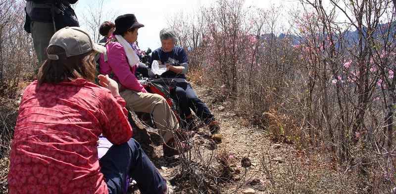 地蔵峠にはピンク色のツツジが咲いている。三葉躑躅(ミツバツツジ)か? 赤八染(アカヤシオ)か? 議論になったが両方とも咲いているようだった。