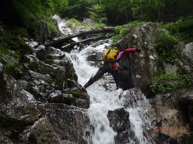 外気温はそう高くは無いが、沢水もそれほど冷たくない。小さな滝やゴーロ帯、堰堤もいくつか超えて二俣に到着。少し上を林道が通っている。右が本流。大滝はまだかな? と独り言を言いながら登っていくと、1725m地点に下段100m滝が見えてくる。いつもはロープをあまり出さないS木さんが、初めからロープを出すと言っている。なんてラッキー。今年は沢に一回登っただけで、登攀に自信が無かったので助かった。H竜さんが上でビレーをしてくれ、緊張せず安心して登ることができた。
