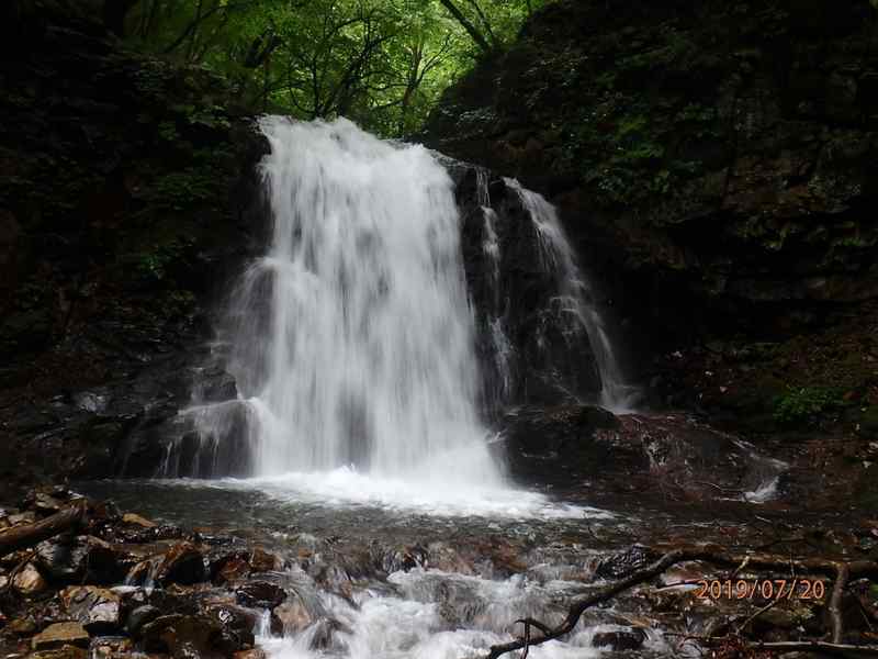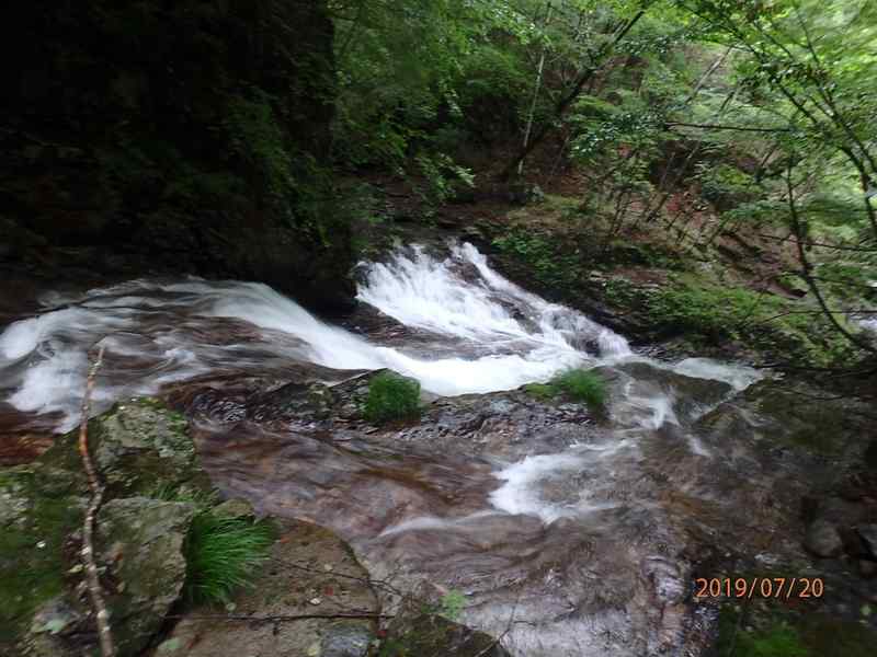 ⑥の階段状2段8×10mは微妙だった。大岩が重なっておりその合間を水が噴き出してくる感じで結構深さもあって足をすくわれそうな流れだ。忍者S木さんはホイホイと先に行ってしまった。MUさんと私とで助け合って右岸から左岸へ渡る。こういうのが案外と難しく感じた。