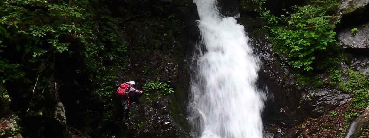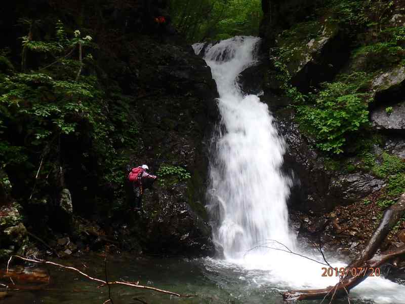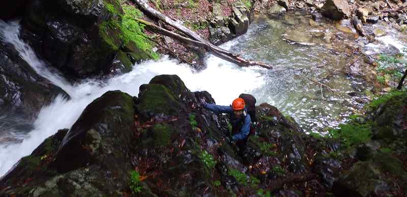 渡り終えたら滝の左岸をクライムダウンすると左が竜バニ谷の流れになる。滝の左岸は難しくない階段状だが、入渓しはじめで緊張してるのでコワゴワだ。