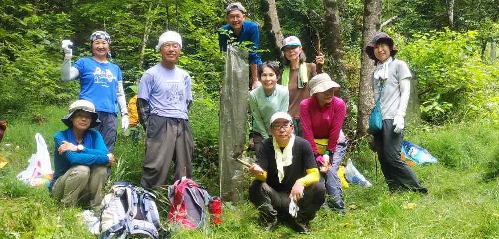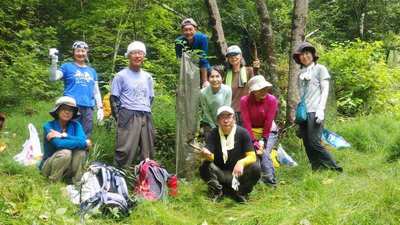 大宮労山50周年記念の植樹の下草刈り、鎌がある方は持参と有ったので、鎌をザックに入れ出発、教えてもらった駐車場に15分前についたが誰もいない、近所の方に尋ねたがここらしい。不安なところに青いシャツの好青年風の長身の方が声をかけてくれた。「大宮労山の方ですか?」「はい」・・・I瀬さんでした。二人とも最近入会した者同士、全く様子がわからず、ただ待つのみ、そしてY城さんの車が登場し、林道終点の駐車場に向かう。先に出発していたH竜さんの車が途中でパンクしたという凄いでこぼこ道を恐る恐る運転し、9:15着。