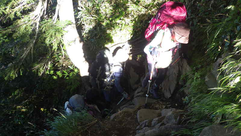 ここら辺ですれ違う人は、みんな朝私たちを抜かしていった人達だった。皆さん日帰りの様だ。多分高速道路を使わないような近距離に住んでいて、明日の天気予報で日帰り登山を決めてきたのだろう。遠いところから来る私達にとっては羨ましい限りだ。