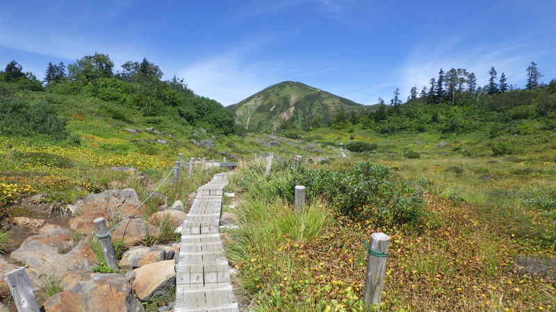 木道の向こうに火打山が見える。花の最盛期はここはすごくきれいなのだろう。