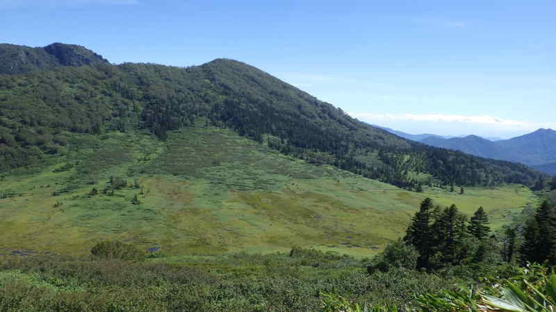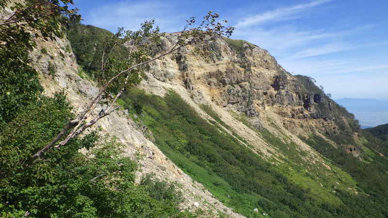 高谷池ヒュッテに戻り、トイレを済ませてから重たいザックを担ぎ歩行再開。黒沢池ヒュッテまでは約100m程の標高差があり、高谷池ヒュッテの方が高かったのでずっと下りだろうと思っていたらそんなことはなくて茶臼山まで登り返す。登山とはそういうものだ。茶臼山までの稜線は片方がスッパリ切れている非対称山稜で向こう側には頸城平野と日本海がよく見えた。