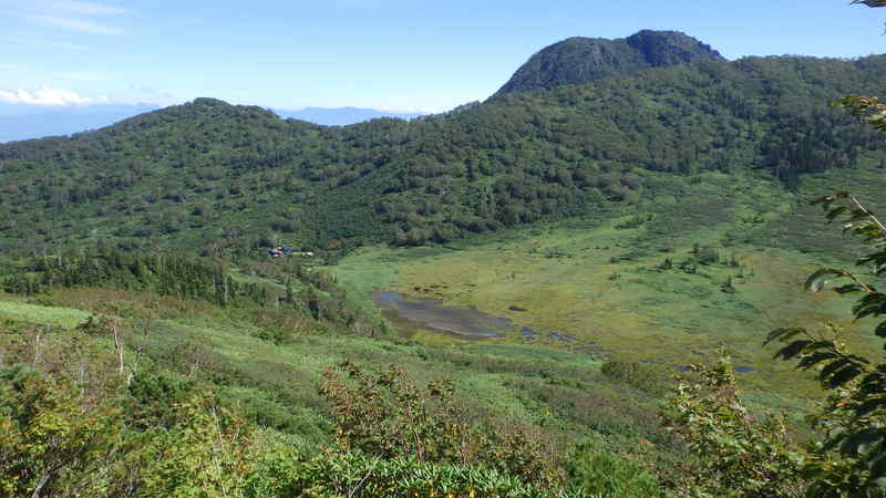 茶臼山を過ぎると黒沢池ヒュッテが見えてきた。黒沢池の伸びやかな湿原と木道がきれいだ。