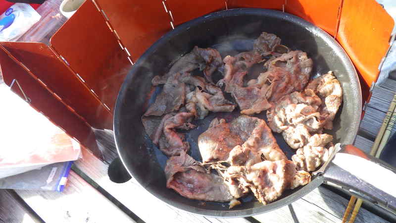 14時30分頃にテントの受付が始まり、一番小屋に近い場所に4人用テントを張る。小屋の前のベンチに戻って夕食。