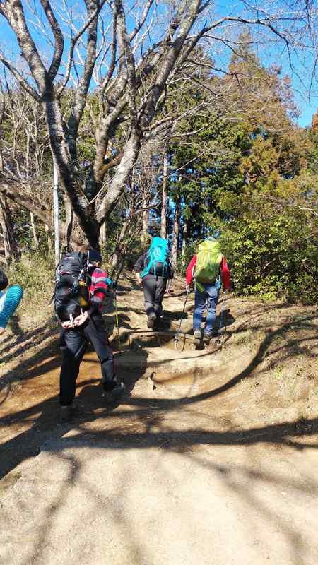 入会して一ヶ月以上が経ち、いろいろな山行に参加させていただき、みなさまのおかげで山を満喫することができています。ありがとうございます。さて、今回は、待ちに待った新春ハイク! 12月の例会見学の際に、年4回の公開ハイクについてお聞きして以来、楽しみにしていました。大宮労山は会山行だけでなく、個人での山行も盛んで、活発な印象を持っていましたが、さらに、みんなが参加できる企画で会の仲間とより一層親しくなれる…なんてステキな取り組みだろう、これは是非とも参加しなければ!…と、立派な志を掲げているようで、実はO野農園の小豆で作ったおしるこに釣られての参加です(笑)すっかり葉を落とした木々の隙間から、柔らかな日の光が注ぎ込み、風もなく、春のような暖かさの中で、ハイキングスタート。私は「にぎやか班」に入れていただき、班の名に違うことなく、楽しいおしゃべりに花を咲かせながら歩きます。途中、みなさまに、いろいろな植物について教えていただきました。私は暗記が苦手で、花や鳥や動物の名前を覚えたそばから忘れてしまうのですが、今回は、とっても覚えやすい仕方で教えていただいたので、家に帰って復習しました。