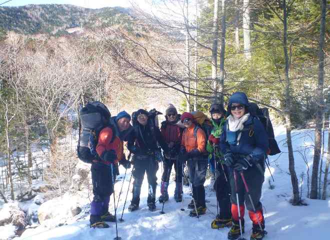 夜中にトイレに起きて戻ってきても自分の寝床スペ-スがあり大きなテントはやはりいい。稜線は強風で危険なので、森林限界までとの案もあったが、H高リ-ダ-判断でこのまま下山。天場付近は森林限界内でも風があり気温以上に寒く感じる。稜線は雪煙が舞っておりその厳しさが想像できた。高度を下げるにつれ風もなくなり気温も上がってきた。