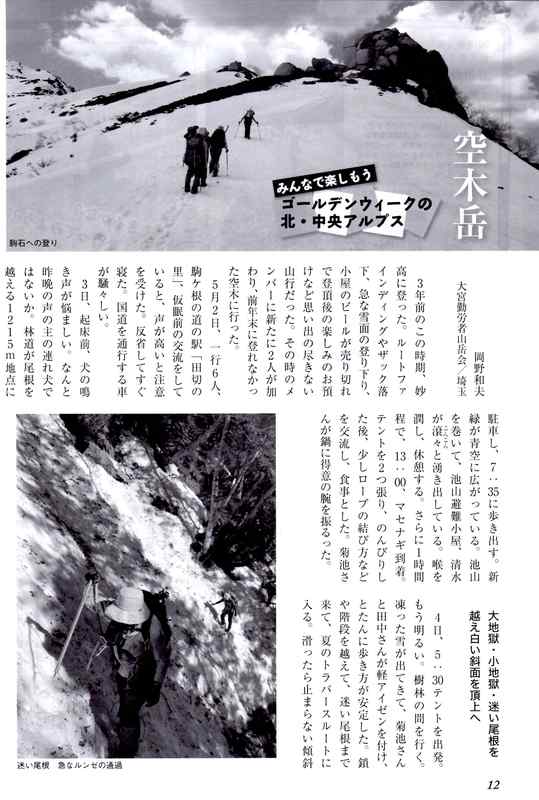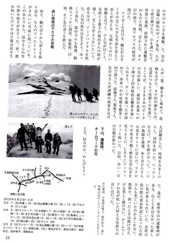 日本勤労者山岳連盟発行の登山時報2020年5月号の特集「みんなで楽しもうゴールデンウィークの北・中央アルプス」に当大宮勤労者山岳会の2019年5月に6人で行った空木岳の記事が掲載されました。よくありがちなアクシデントをチームワークで乗り越え頂上に立った記録です。新緑の中を抜け、雪が出てきてテン泊。次の日は体調をくずした仲間を皆で助け合い登頂。雪を踏み抜きながら下山し、腐った雪のためにルート変更を余儀なくされヘッデンでテン場まで帰ってきた様子が描かれています。