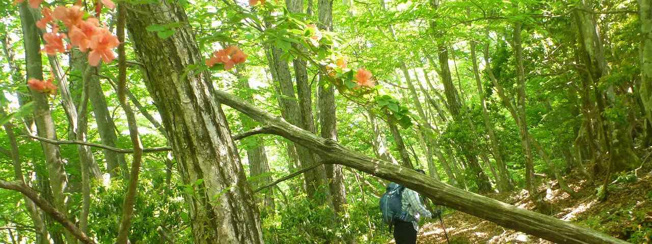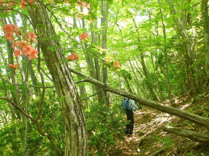 尾根が近くなり、ふと周りを見回す。広葉樹が出てきた。あれ⁈ 新緑どころかもう濃い緑だ。今年、ツリーホール見なかった。足元に咲くイワウチワもスミレも見なかった。様々な色の点描画のような淡い新芽も見なかった。新緑を透かして通ってくる柔らかなお日様も見なかった。いつの間に…。山行再開後の木々は新緑ならず既に深緑だった。ツツジが咲いていた。既にツツジの季節なのね。また「ファー」