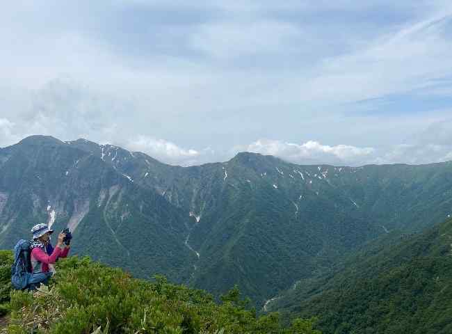 フー、山頂到着。前回は山頂を越え、笠ヶ岳の鞍部まで行ったが、今日はガスが上がって来ているので山頂でUターン。馬蹄形の稜線は雲の中だ。笠ヶ岳もガスの中。見下ろすと松木沢の頭さえ時折ガスに包まれてしまう。新潟側から雲が流れて来ている。お天気は下り坂のようだ。雨に濡れたくない。もう汗でグショグショだけど。