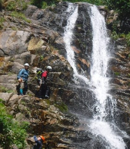 最初のF2・約15mの滝は、右壁を高巻きロープ確保で登ったが、あとはフリーで登れる小滝が連続した。源頭部に近づくと沢筋が細くなり涸れだして遡行の終了を真直に感じ寂しくなるが、振り返ると沼原池などが眺望でき、登る先には茂った緑の先にスカイブルーの夏空と真っ白モクモクの雲が望め、そこに向かって突き上げる感じがたまらなく夏を感じさせてくれた。