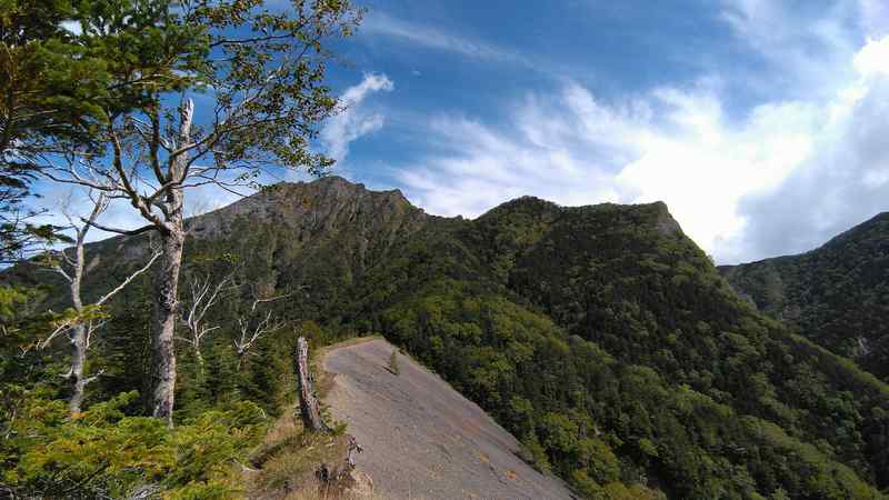 中央稜は、しばらくザレた急坂が続き、下るのに苦労しますが、徐々に穏やかな道へと変化します。樹林帯に入ってからも明るい雰囲気で、「ハイキングに来たらとても楽しいだろうな」と思わせる道になり、南陵とはまた違う趣きがあります。