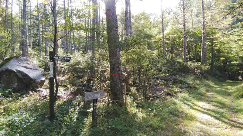尾根に上がると、途端にハッキリしたきれいな道になっていて、今までの登りとの落差に驚かされます。作業のために頻繁に歩かれているためか、一般登山道よりもずっと歩きやすく、所々に立てられた財産区境界標識がまるで登山者を導く道しるべのようです。