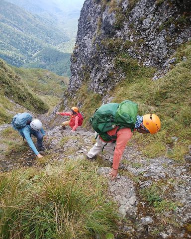 ここで、阿弥陀南陵の核心部に入る前に、ヘルメット、念のためチェストハーネスを装着。チェストハーネスもたまに作り方を復習しないと、結び方を忘れてしまいます。アセアセしながらも、キチンと結ぶことができ、ホッとしながら岩稜帯を目指します。