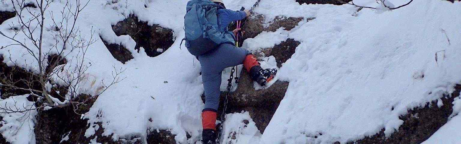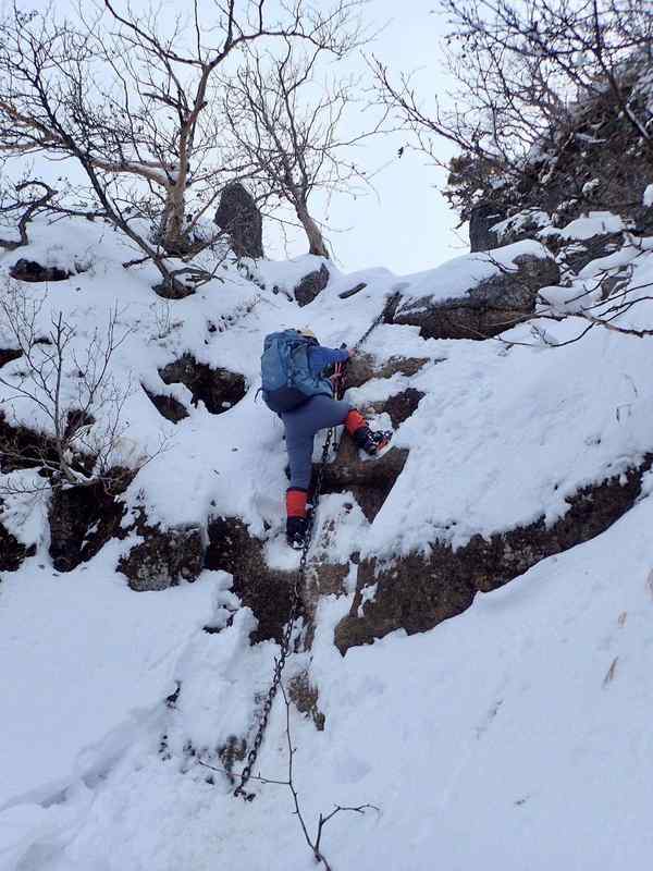 鎖場を3つ4つ越えたあたりだったでしょうか? 足場が雪で不安定な上、ほぼ垂直な鎖場が続いたところで、だんだん私も登頂後の下降が心配になってきました。