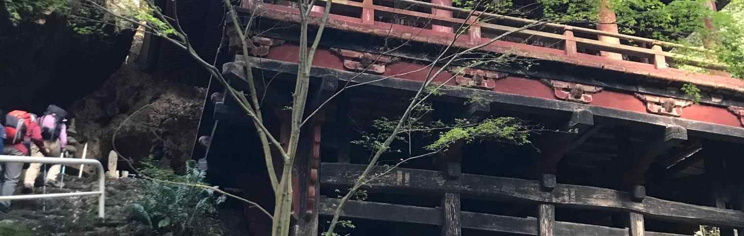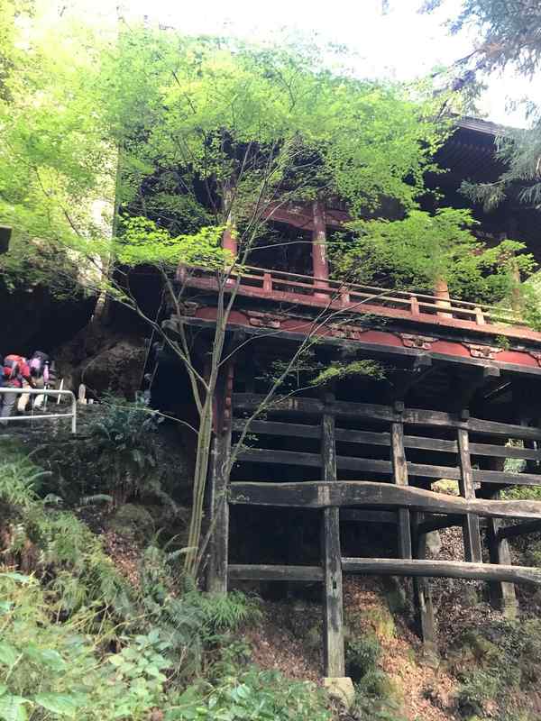 そこからは岩交じりの鎖やロープが続き、アップダウンを繰り返すと、もっと驚く建物に出会うことになった。断崖の上に京都の清水寺の舞台作りのような造りの観音堂が現れたのです。朱塗りの「岩井堂」です。