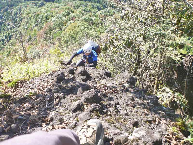 大人の滑り台を登り切り、左右に岩場が登場する。迷うことなく左を登るが、H竜さんは右じゃないか? との意見。ホールドした岩が剥がれる脆い岩をゼイゼイ言いながら登り詰めると、ナントこれ以上は登れないという急斜面が控えていた。ロープを出すにも支点を取る様なピナクルは見当たらず。やはり右だったか!