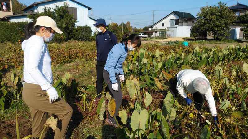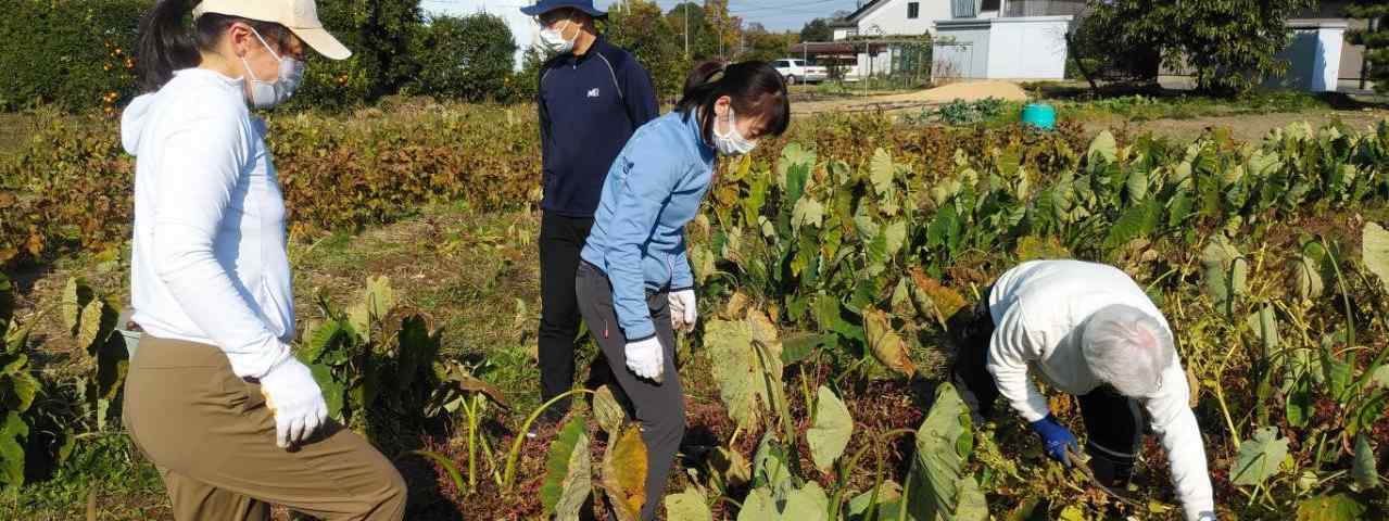 それでは畑にいざ出陣! O野さんの畑には、八ツ頭、里芋、京芋、薩摩芋と、種類豊富にお芋が植わっていて、O野さんがスコップを入れると、土の中からゴロゴロとお芋が出てきて、楽しーい! 面白くて、お芋の泥落としに没頭していると、気付いたらネコ車がお芋でいっぱい。さすがにこれは採りすぎなのでは…とO野さん以外はみな焦ってしまいます。そんな私たちにO野さんが、「このみかんも食べてみて」と。皮を剥くと瑞々しいみかんの香りが弾けて、爽やかな気分に。甘味と酸味のバランスの良い、美味しいみかんをいただいてから、他にも、丹波の黒豆や小豆なども見せていただき、童心にかえってはしゃいでしまいました。