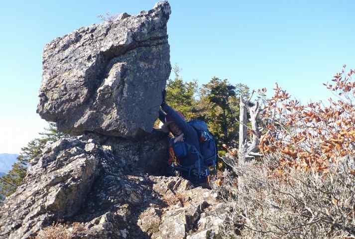 痛めている右膝も折れない。右足が岩にハマって動かない。どうにかこうにか足を動かして下りられた。フー。「ここが一番の核心かもな」とH竜さん。その後は地図&T羽さんによると『幸せな尾根歩き』が待っていてくれるはず。が、然にあらず。待っていたのはまたもアップダウンだった。