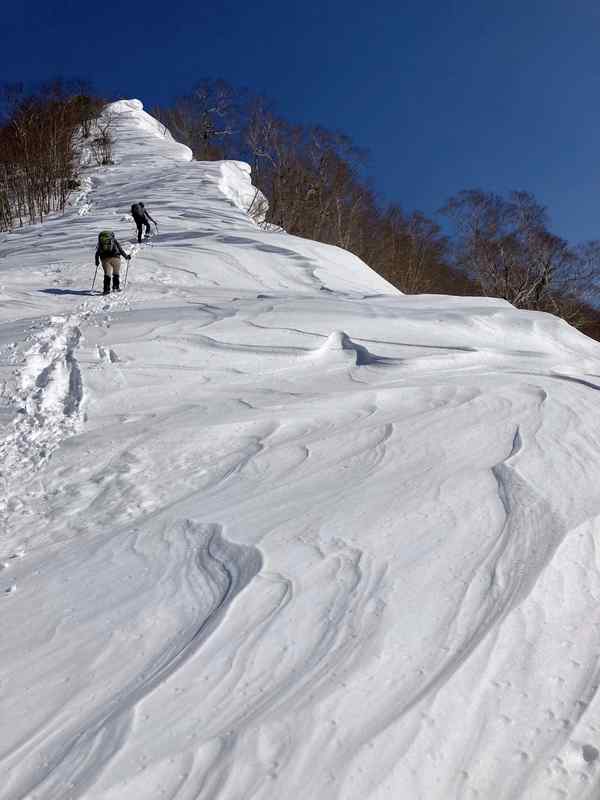 続いて、ムタコ沢ノ頭(1447mピーク)へは快適な稜線だったが、アイゼンを選択した同行者二人(僕はスノーシュー)は、花魁の高下駄のようになっていてワカンに履き替えた。