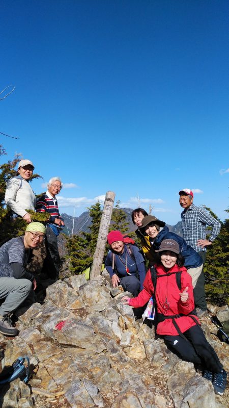 岩を急下降、クライムダウンして、発見した尾根へ向かう。その後も岩の登り降りを繰り返し、O野Lの3度目の「この登りが最後の登りだ!」の掛け声とともに頂上に到着した。