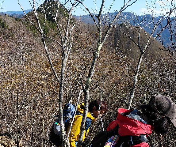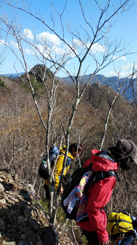 風が強く、上着を着こんで待ったが、なかなか後方チームは現れず、声も聞こえない。20分ほど待ち、「何かあったかもしれない。降りよう!」とO野Lが英断し、下山に向けて立ち上がったところで後方チームの先頭のT川さんがひょっこり現れた。感動の再会!!