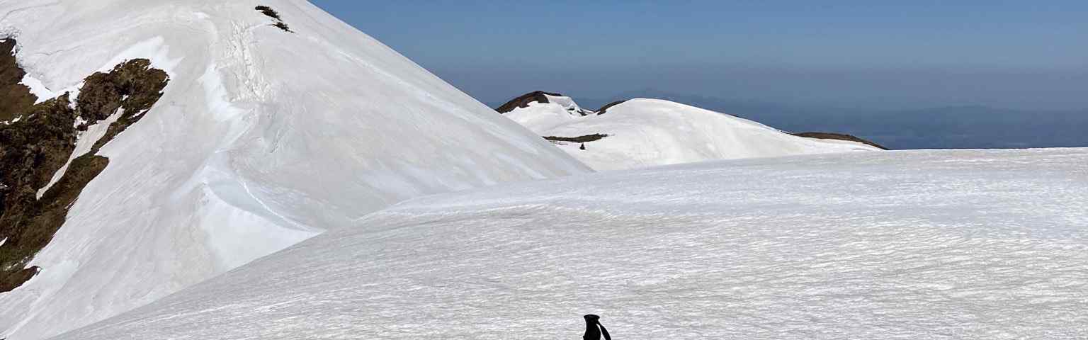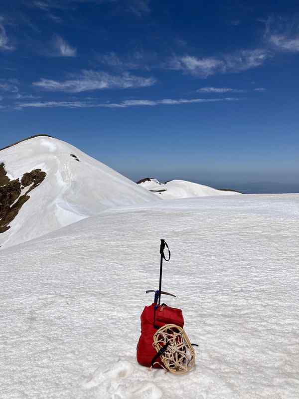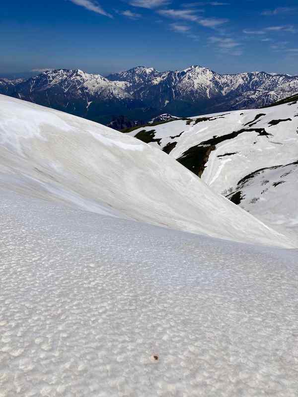 帰りがけに地元の方に聞いてみたらGWの例年の残雪量の1/3くらいだそうだ。 ヌクビ沢源頭の鞍部直下までは順調だったがいつもなら顔を出している詰めのところの登山道が雪庇で覆われていて僕には太刀打ちできなさそうだった。そこで、やや右手に登っていく尾根に取り付いて鞍部を目指すことにしたが、上部は30度超の斜度と言う感じでビビりの僕はちょっと緊張した。稜線に出てしまえばこっちのもの! 上越国境稜線、越後三山、遠く妙高・火打から後立山まで見渡すことができた。