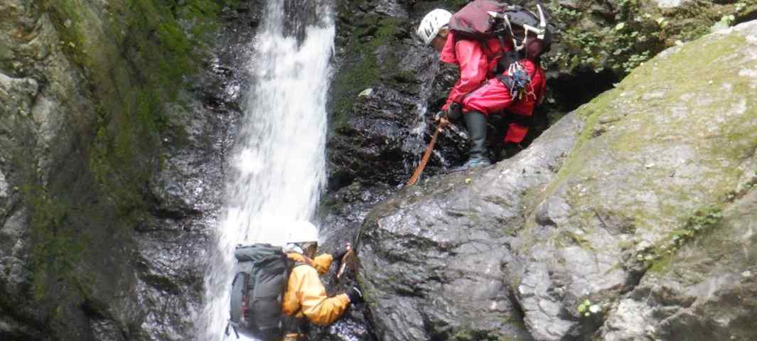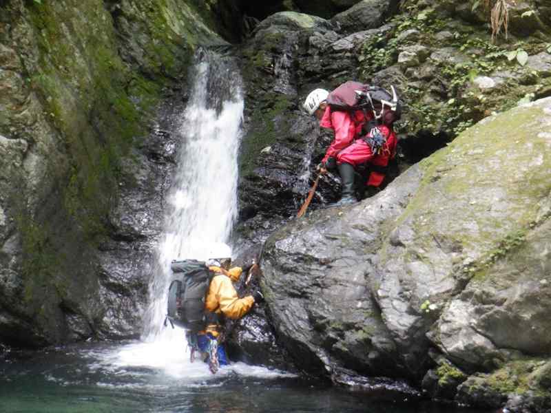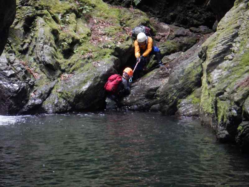 全員のザック・ウエアーから水がポタポタと滴り落ちている。スリング2本でザックを固定しビート板で泳ぐようなイメージで釜を突破する。GKさんがロープで後続者を引き上げて下さいました。